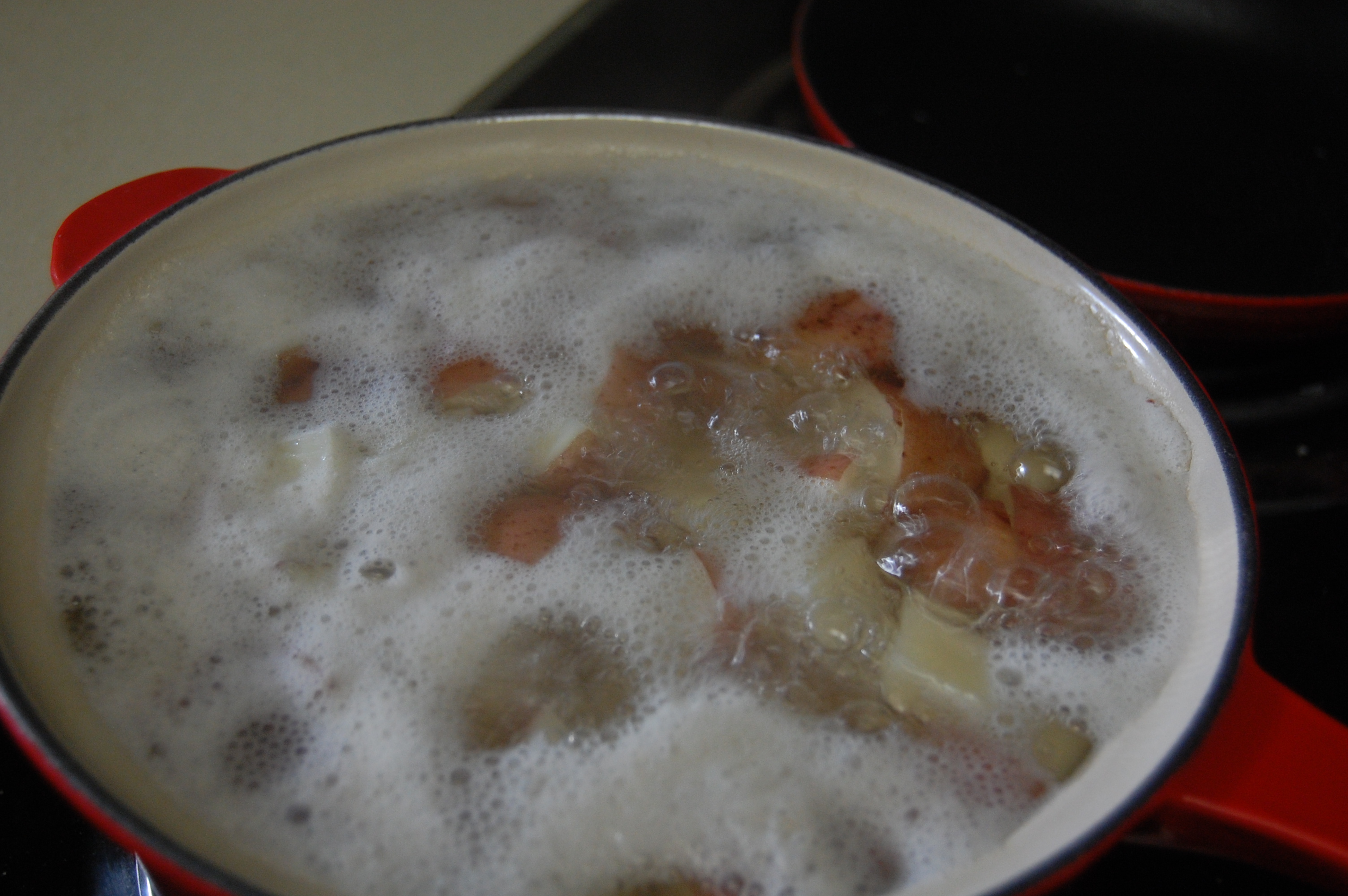 - Put potatoes in a pot and fill with water to about 1-2 inches above the potatoes. Boil until potatoes get soft and edges start to crumble.