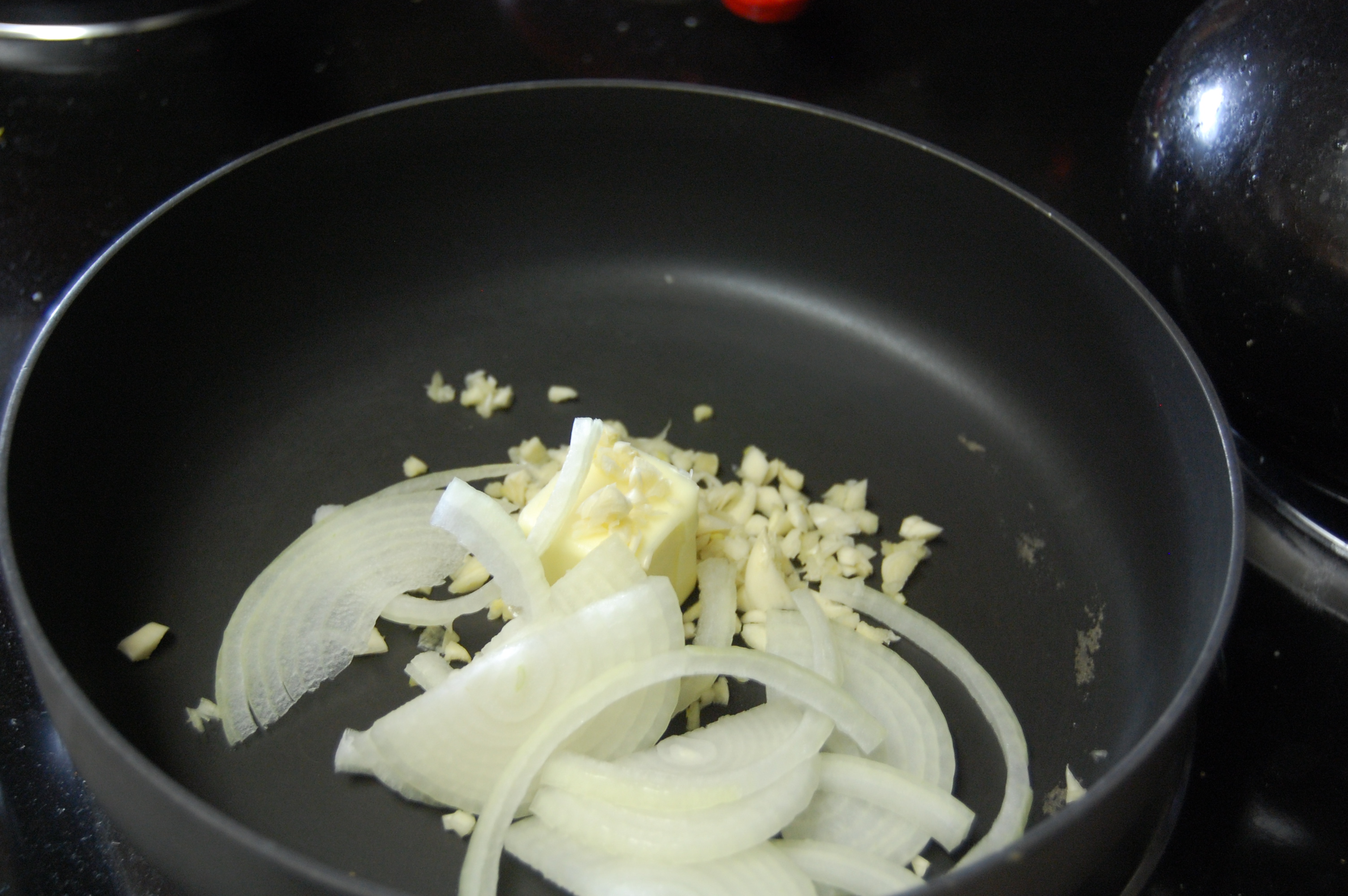 - In the meantime, sauté the butter, onions and garlic over medium heat until the onions are soft.