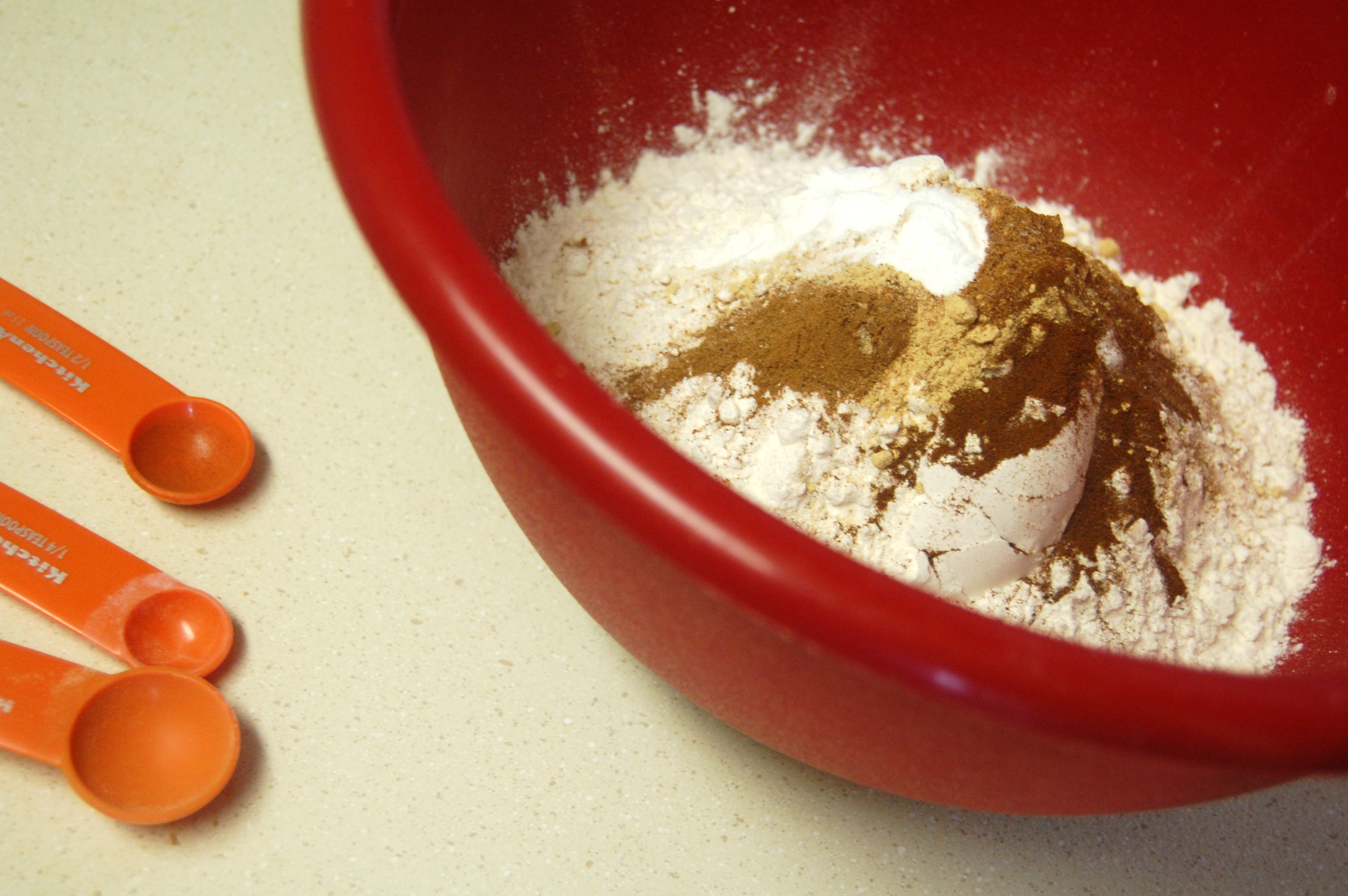 - Combine the flour, cinnamon, baking powder and salt. Set aside.